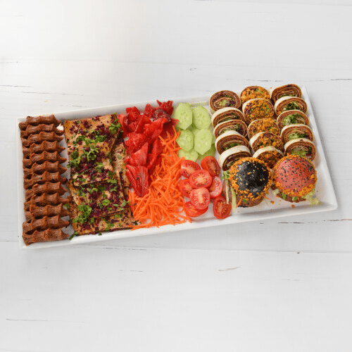 Familiebox voor 4 personen. Doritos sushi voor 2 personen en çiğköfte voor 2 personen, 1 bakje tursu en 1 bakje salade met daarbij ijsbergsla, citroen, pittige saus, granaatappelsaus en 3 lavas